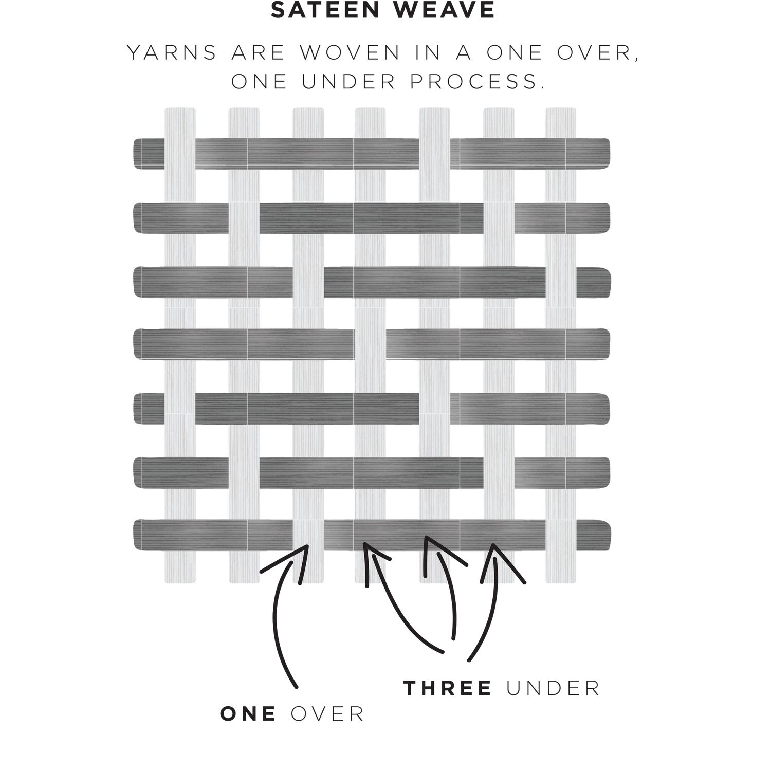 Sateen is a one-yarn-under and three-yarn-over weave. More thread surface exposed by the three-over, one-under weave is what gives sateen its signature silky-soft feel and luminous sheen. Sateen is more tightly woven and heavier in weight making it warmer and buttery soft, ideal for year-round comfort.